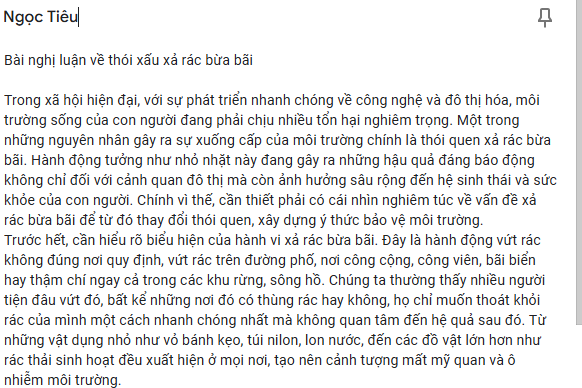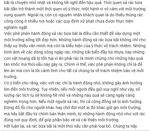Việc xả rác bừa bãi là một thói xấu cần phải loại bỏ. Chỉ khi mỗi người dân thay đổi thói quen và có ý thức hơn trong việc giữ gìn môi trường sạch sẽ, chúng ta mới có thể bảo vệ được thiên nhiên, bảo vệ sức khỏe cộng đồng và tạo dựng một xã hội văn minh. Hãy cùng nhau bắt tay hành động, tạo ra một môi trường trong lành, xanh – sạch – đẹp cho thế hệ mai sau.