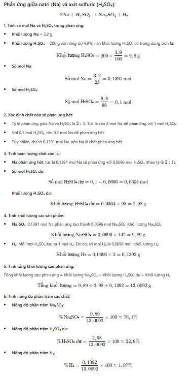 cho 3,2g Na phản ứng với 200g H2SO4 4,9% tính nồng độ % các chất sau phản ứng