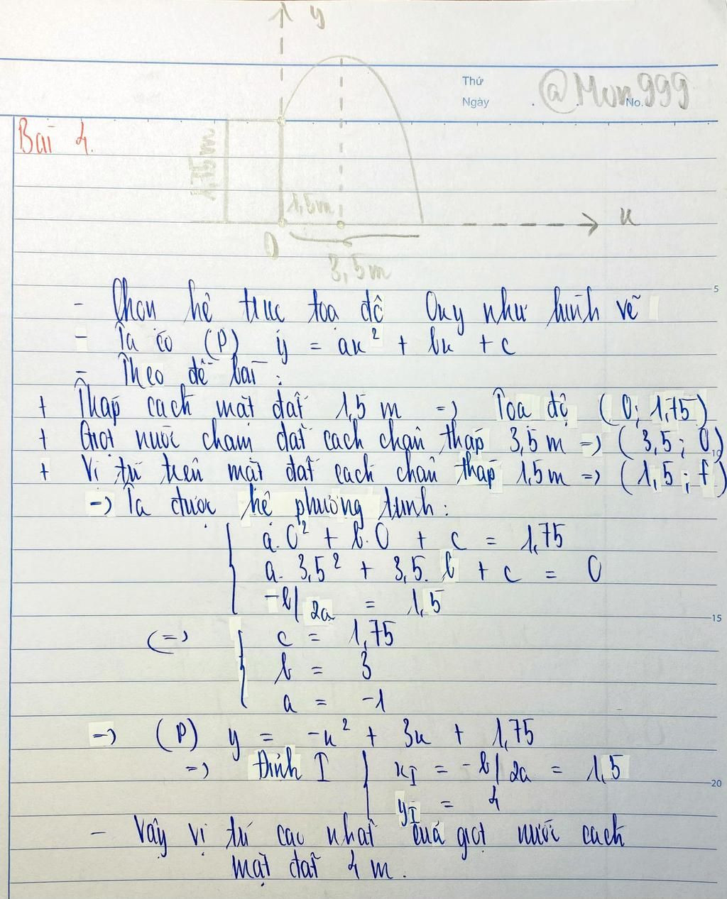 Ở một điểm cao trên tháp cách mặt đất 1,75 m nhà thiết kế có một đặt một vòi phun nước tạo hình cầu vồng biết rằng đường đi của các giọt nước sau khi ra khỏi vòi có dạng đường cong parabol và chạm đất tại một vị trí cách chân tháp 3,5 m người ta ước thấy tại một vị trí trên mặt đất cách tháp 1,5 m thì giọt nước ở vị trí cao nhất. Hỏi vị trí cao nhất của giọt nước cách mặt đất bao nhiêu mét