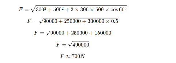 Câu1.Hai người cùng kéo một con thuyền với hai lực F1=vectơ OA, F2 = vectơ OB có độ lớn nhất lần lượt là 300N, 500N cho biết góc giữa hai vectơ là 60 tìm Độ lớn của vectơ hợp lực F là tổng của hai lực F1 và F2