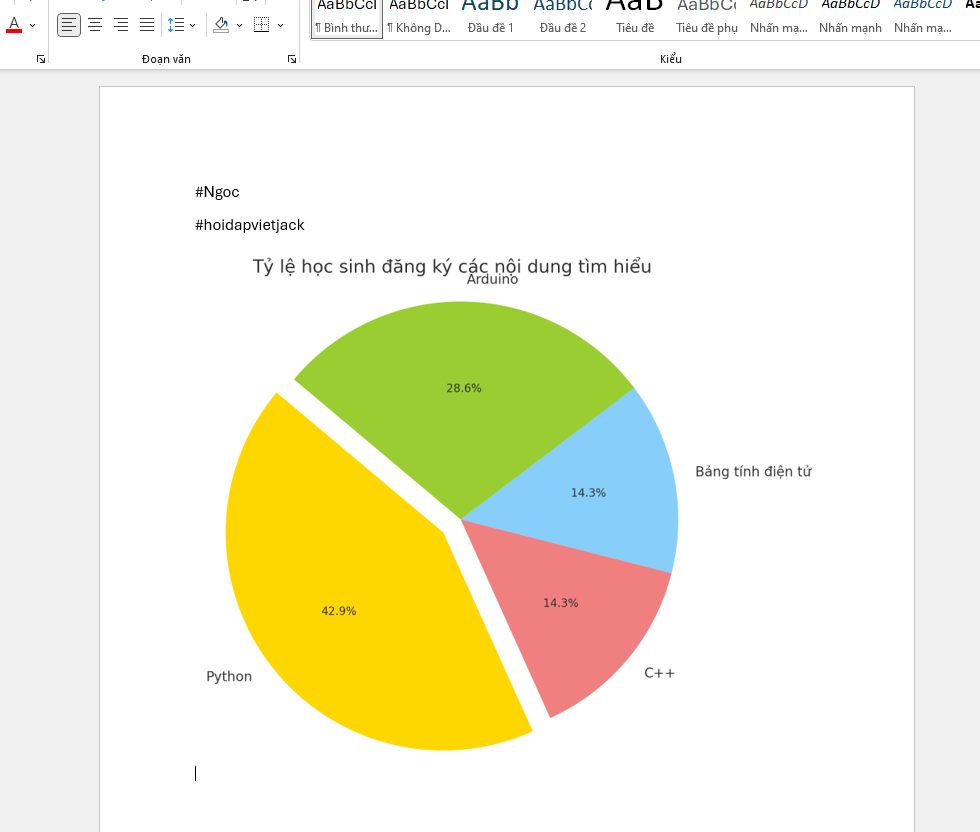 Tô màu và ghi chú: Tô màu khác nhau cho từng phần và ghi chú tên nội dung tương ứng (Python, C++, Bảng tính điện tử, Arduino) để hoàn thiện biểu đồ
