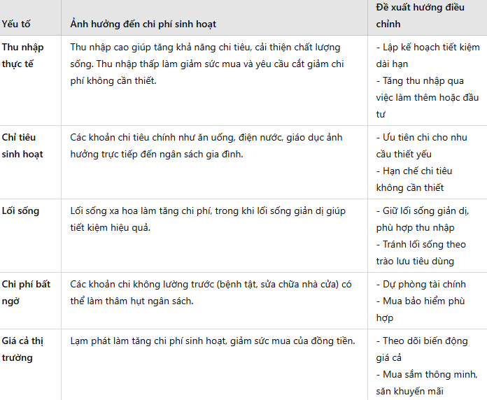 Lập bảng phân tích ảnh hưởng của thu nhập thực tế quyết định chỉ tiêu và lối sống đến chi phí sinh hoạt trong gia đình mình và đề xuất hướng điều chỉnh phù hợp