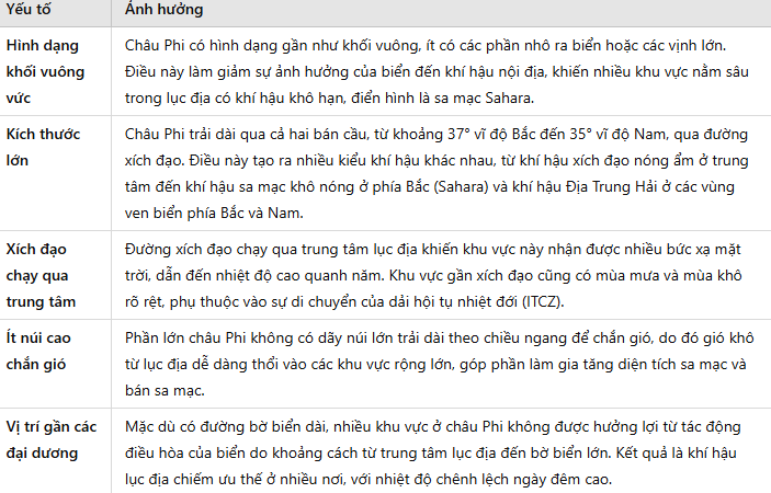 Hình dạng và kích thước của châu Phi có ảnh hưởng quan trọng đến khí hậu của khu vực này. Dưới đây là một số điểm chính về cách các yếu tố này tác động đến khí hậu của châu Phi: