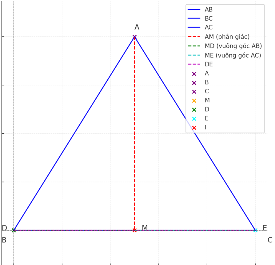 c) Vẽ MD vuông góc với AB (D thuộc AB), ME vuông góc với AC (E thuộc AC). Gọi I là giao điểm của DE và AM. Chứng minh I là trung điểm của DE.