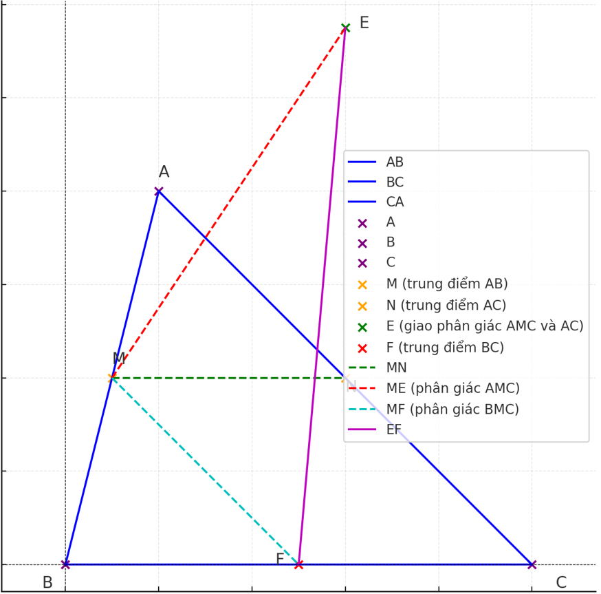 MF là tia phân giác của góc BMC nên ta có:BF/FC = BM/MC (tính chất đường phân giác trong tam giác)