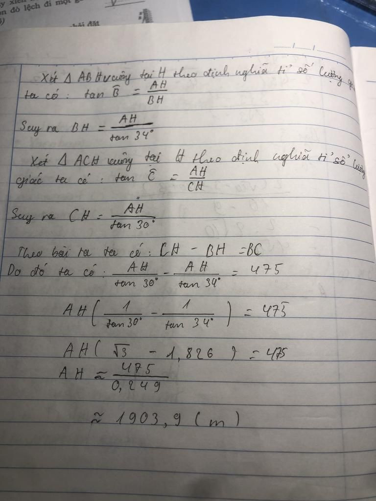 Để xác định chiều cao AH của một ngọn núi người quan sát đến từ hai vị trí b và c cách nhau 475 m trên mặt đất tại vị trí b người đó quan sát đỉnh núi với phương nhìn tạo với phương nằm ngang một góc bằng 30 độ tính chiều cao của ngọn núi đơn vị mét biết rằng tầm mắt của người quan sát là 1,6 m và giả thiết ba điểm h. b. c thẳng hàng