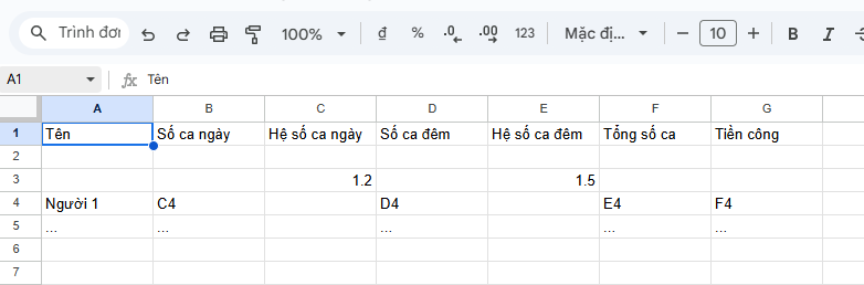 Trong ô D3, nhập: 1.5 (Hệ số ca đêm, giả sử hệ số ca đêm là 1.5)