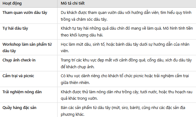 Xây dựng một trang trại dâu tây kết hợp các hoạt động trải nghiệm nông nghiệp và du lịch xanh, mang đến cho khách hàng cảm giác gần gũi với thiên nhiên, thư giãn và học hỏi.
