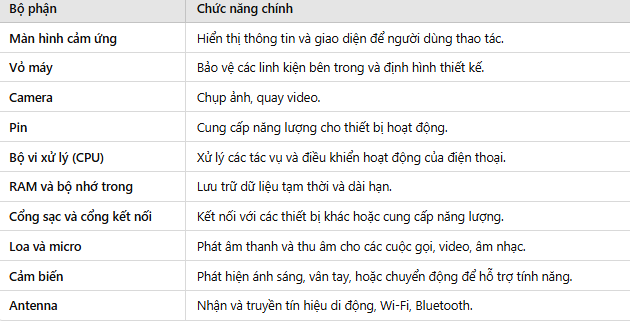 Nêu tác dụng chính và kể tên các bộ phận cơ bản của điện thoại thông minh