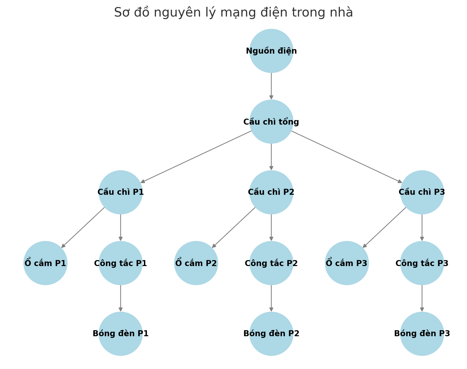 Dây pha (L): Đi qua cầu chì tổng → chia thành 3 nhánh qua cầu chì nhánh → công tắc → bóng đèn và ổ cắm.