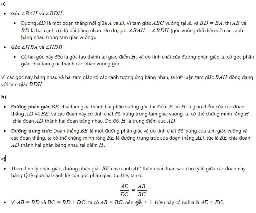 Vì BE là đường phân giác của ∠ABC nên nó cũng là đường trung trực của đoạn thẳng AD (do AD nằm trong tam giác cân △ABD)
