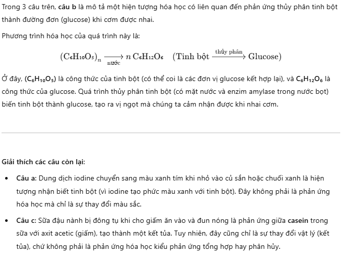 Câu (b): Khi nhai cơm, enzym amylase trong nước bọt phân hủy tinh bột thành đường maltose, đây là một quá trình sinh hóa chứ không phải phản ứng hóa học theo nghĩa truyền thống.