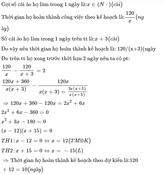Câu 5 : Một tổ may dự định may 120 cái áo trong một thời gian nhất định . Do cải tiến kỹ thuật , tổ may tăng năng suất mỗi ngày 3 cái áo nên xong trước thời hạn 2 ngày . Tính thời gian dự định hoàn thành công việc của tổ ?