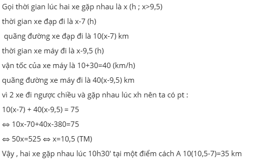 Câu 6 : Hai địa điểm A và B cách nhau 75km . Lúc 7h , một người đi xe đạp đi từ A->B với vận tốc 10km/h . Sau đó , lúc 9h30