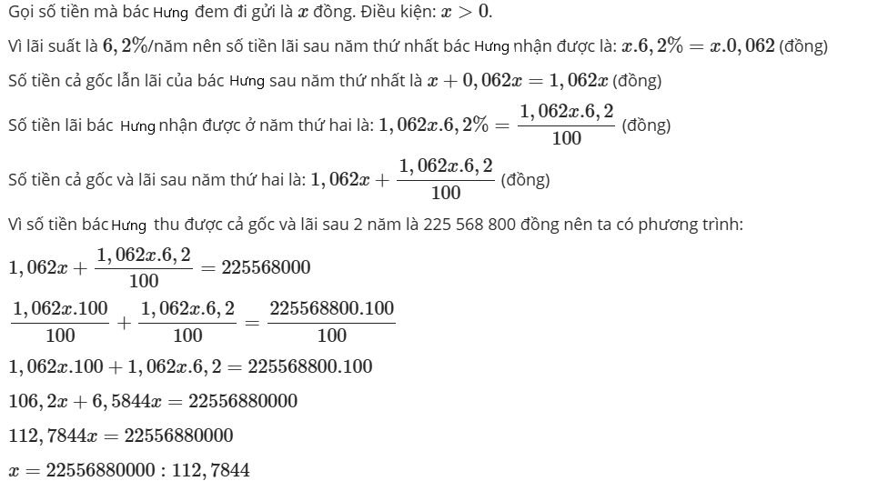 Câu 7 : Bác Hưng gửi tiết kiệm một số tiền tại một ngân hành với lãi suất 6,2% năm với kì hạn 1 năm , tiền lãi của kì hạn đó lại được cộng vào tiền gốc . Sau khi gửi 2 năm bác rút lại được số tiền cả gốc lẫn lãi là