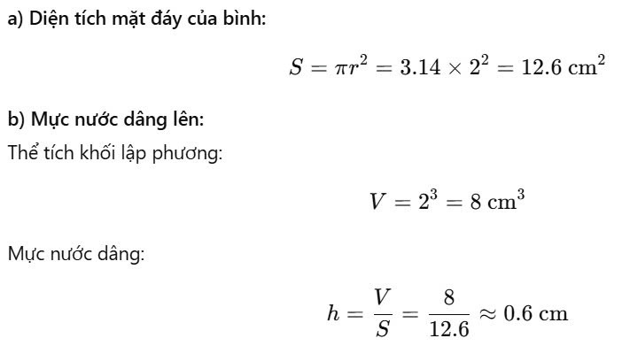 b) Người ta bỏ 1 khối đồng hình lập phương có cạnh dài 2cm vào trong bình thủy tinh, hỏi mực nước trong bình dâng cao thêm mấy cm? (làm tròn các kết quả 1 chữ số thập phân)