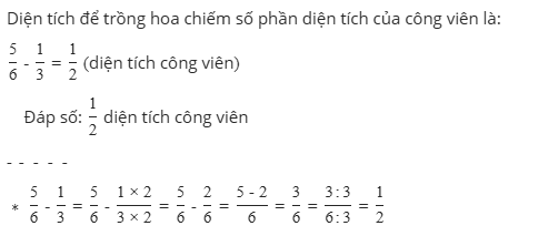 Trong công viên người ta sử dụng 5/ 6 diện tích để trồng cây xanh và hoa trong đó có 1/3 diện tích của công viên là trồng cây xanh diện tích còn lại để làm đường hỏi a diện tích trồng hoa là bao nhiêu phần diện tích công viên b diện tích làm đường đi là bao nhiêu phần công viên