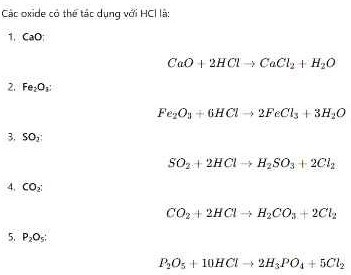 cho các oxide sau oxide nào có thể tác dụng với HCl : CaO , Fe2O3, SO2, CO2, P2O5 . Viết phương trình hóa học