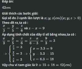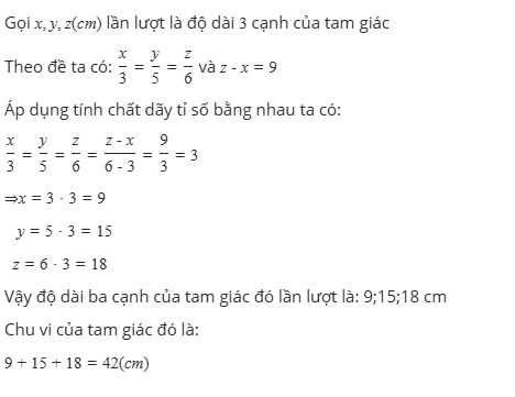 . Biết các cạnh của một tam giác tỉ lệ với 3; 5; 6 và hiệu giữa độ dài cạnh lớn nhất và cạnh nhỏ nhất là 9cm. Tính chu vi tam giác đó.