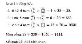 Vậy, có tổng cộng 1414 cách chọn một tổ gồm 6 người từ 14 người (8 nam và 6 nữ) sao cho số lượng nữ trong tổ không vượt quá 2 người. Bài toán này là một ví dụ điển hình về việc áp dụng kiến thức tổ hợp để giải quyết các vấn đề thực tế, đòi hỏi sự phân tích kỹ lưỡng các trường hợp có thể xảy ra và áp dụng đúng công thức tính toán.