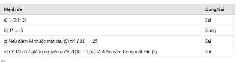 2. Trong không gian Oxyz, cho mặt cầu (S): x ^ 2 + (y + 1) ^ 2 + (z - 3) ^ 2 = 25 có tâm I và bán kính R. Xét tính đúng sai của các mệnh đề sau: