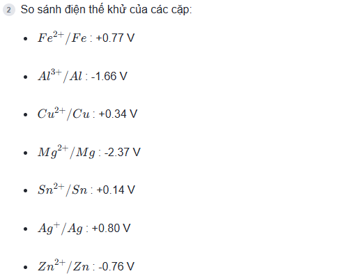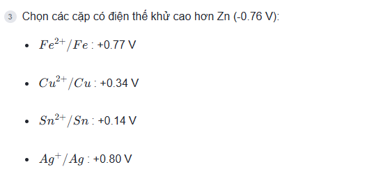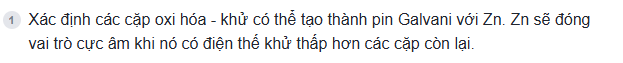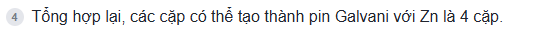 Cho các cặp oxi hoá - khử Fe²+/Fe , Al³+/Al, Cu²+/Cu, Mg²+/Mg, Sn²+/Sn , Ag+/Ag. Nếu pin Galvani được tạo bởi một cặp oxi hoá - khử được cho ở trên và cặp oxi hoá - khử Zn²+/Zn . Số lượng pin Galvani mà Zn đóng vai trò là cực âm là bao nhiêu?