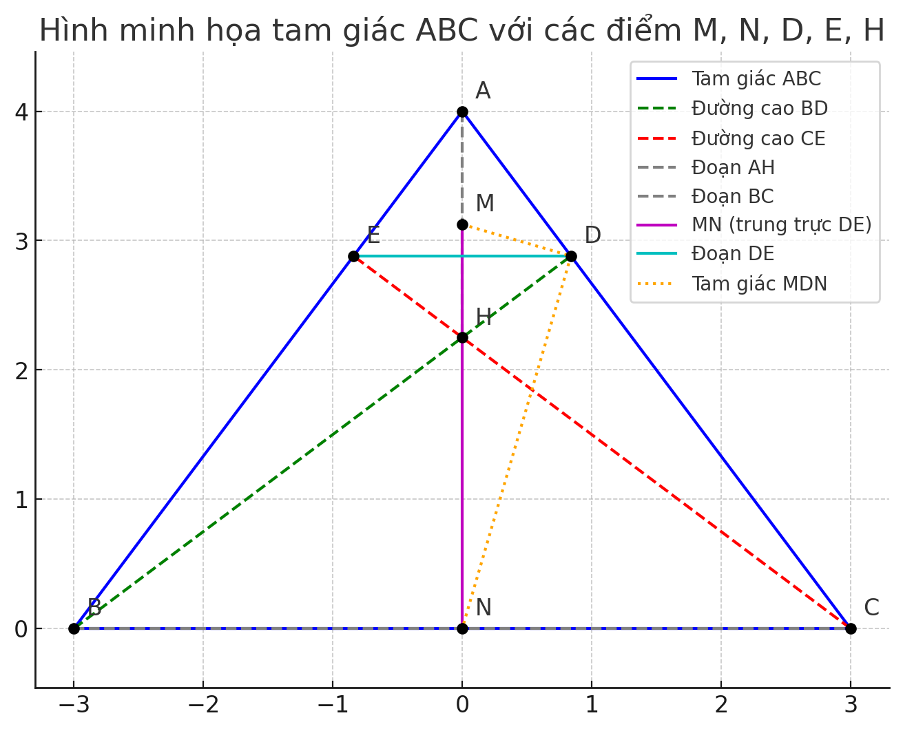 Đề bài: Cho tam giác nhọn ABC có BD và CE là hai đường cao cắt nhau tại H. Gọi M, N là trung điểm của AH và BC. Chứng minh:
