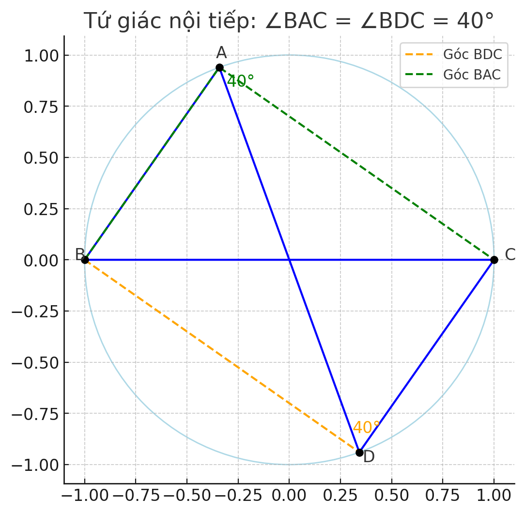Trong tứ giác nội tiếp \(ABCD\), góc \(\angle BAC\) và góc \(\angle BDC\) cùng chắn cung \(BC\)