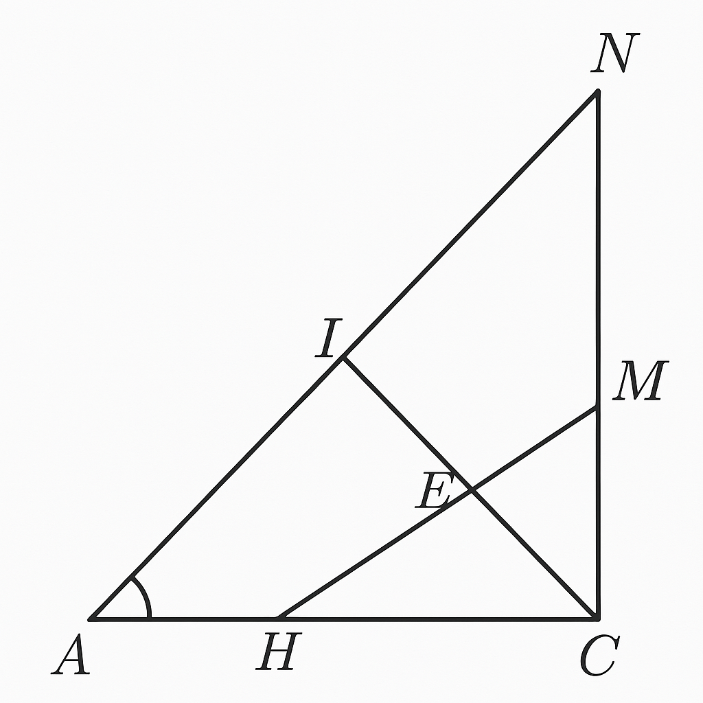 Cho ΔABC vuông tại A ( AB < AC), đường cao AH, lấy điểm I trên cạnh BC sao cho H là trung điểm của BI, đường thẳng đi qua C vuông góc với tia AI tại M cắt tia AH tại N.