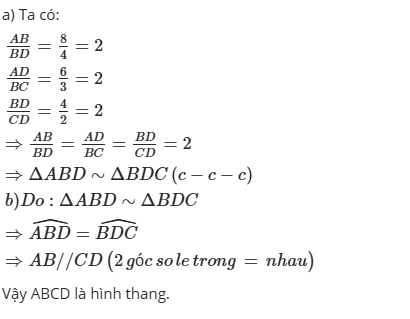 Vì \( BD \) là đường chéo chung, ta xét xem liệu 2 tam giác có góc \( \angle ABD \) và \( \angle CDB \) bằng nhau không? Không có góc nào bằng nhau rõ ràng → dữ kiện đề không đủ chứng minh đồng dạng nếu không có góc hoặc cạnh bằng