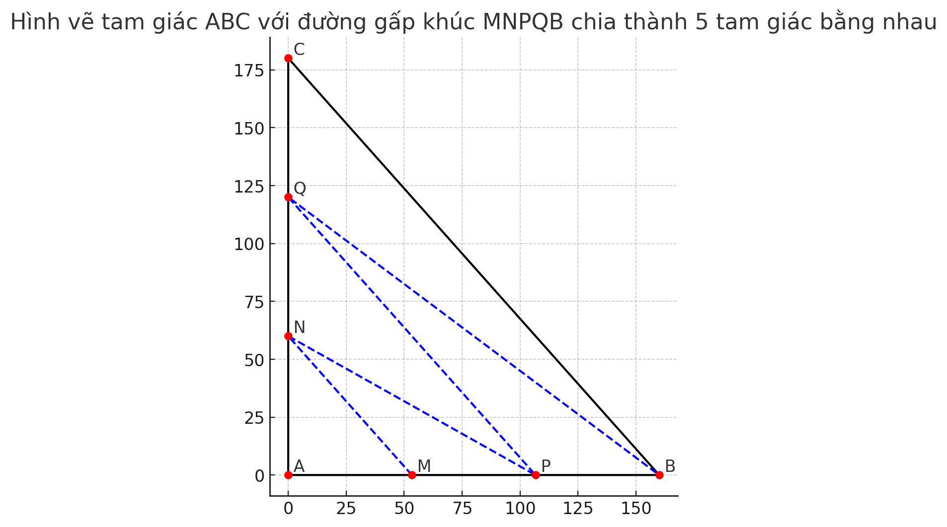 Cho tam giác ABC. Lấy đierrm M, P trên cạnh AB và các điểm N, Q trên cạnh AC sao cho đường gấp khúc MNPQB chia tam giác ABC thành 5 tam giác có diện tích bằng nhau. Tính độ dài đoạn MP và NQ biết AB bằng 160cm, AC bằng 180 cm