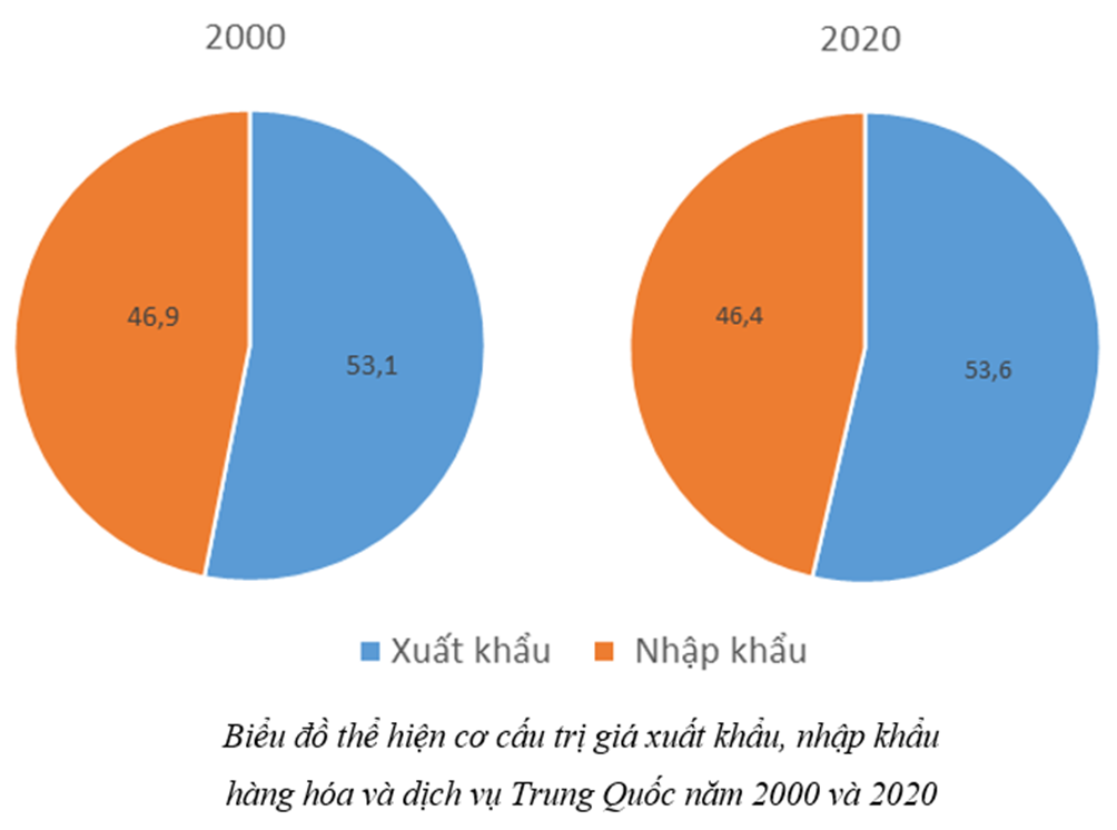 ♦ Nhận xét: Nhìn chung cơ cấu trị giá xuất khẩu, nhập khẩu hàng hóa và dịch vụ Trung Quốc năm 2000 và 2020 có sự thay đổi, tăng tỉ trọng trị giá xuất khẩu và giảm tỉ trọng trị giá nhập khẩu song vẫn duy trì tỉ trọng trị giá xuất khẩu cao hơn trị giá nhập khẩu.