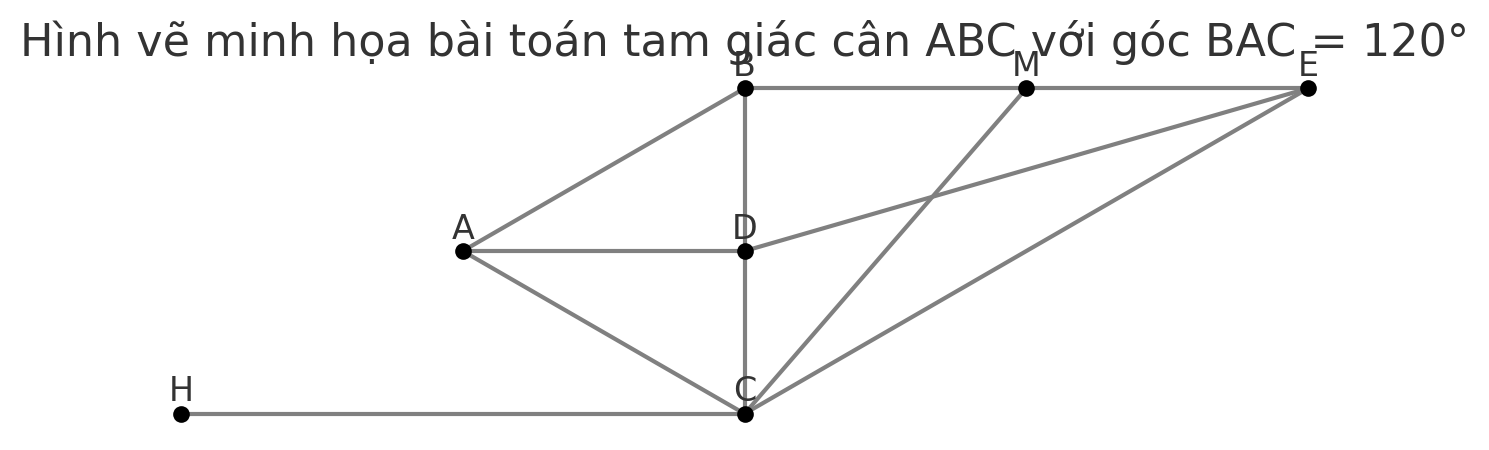 - Tam giác ABC cân tại A, \( \angle BAC = 120^\circ \)