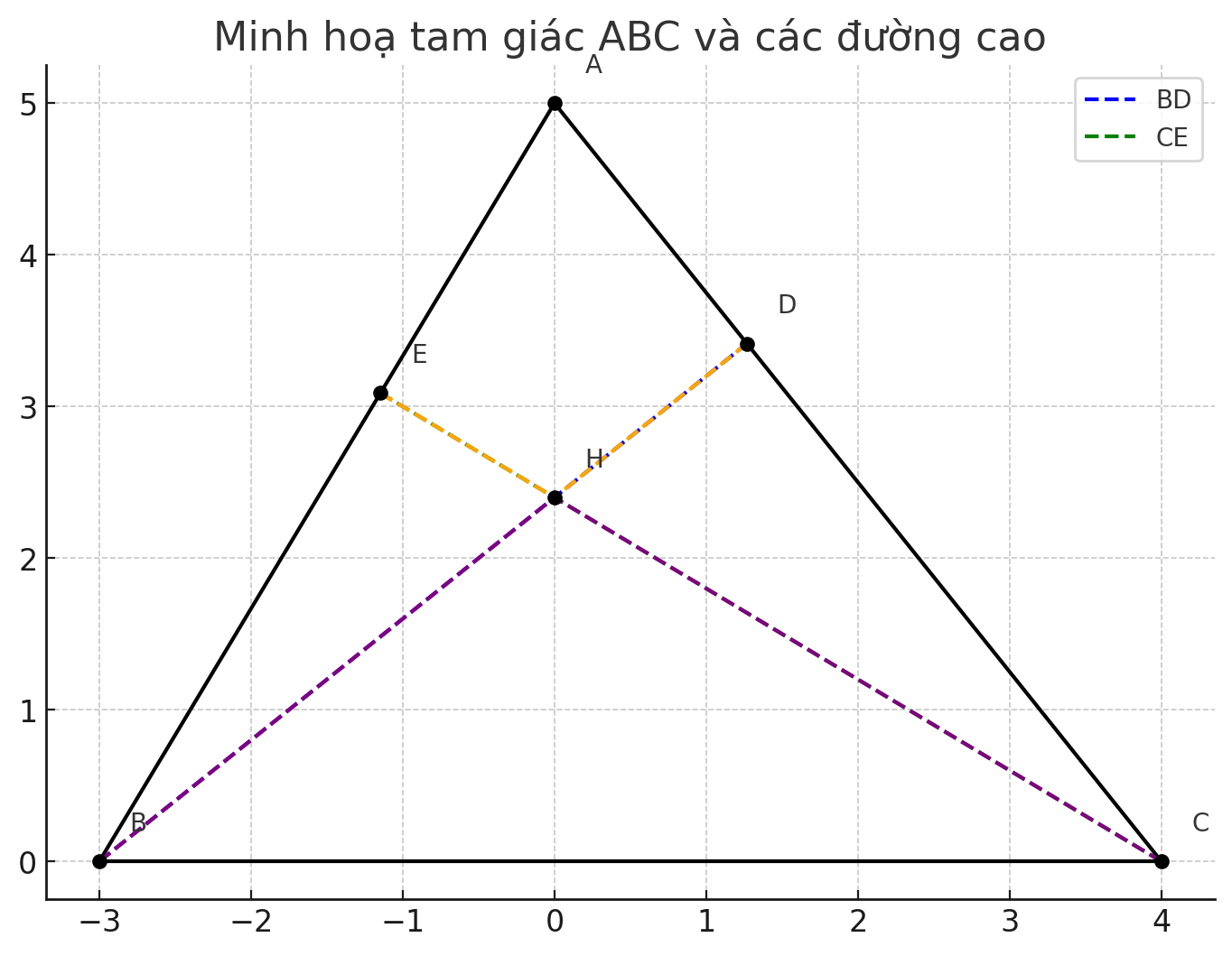 - \( \angle ADB = \angle AEC = 90^\circ \) (do BD và CE là đường cao)