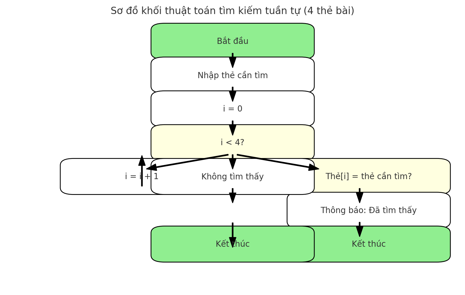 Trên là sơ đồ khối mô tả thuật toán tìm kiếm tuần tự trong 4 thẻ bài đã sắp xếp. Sơ đồ thể hiện quy trình: