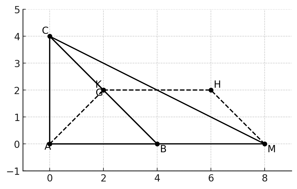 - Qua \( K \), kẻ đường thẳng song song với \( BM \), cắt \( CM \) tại \( H \).