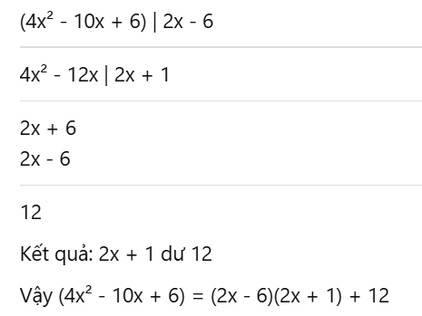 ( 4x² - 10x + 6 ) : ( 2x - 6 ) giải theo cột dọc giúp mình đc k ạ😢