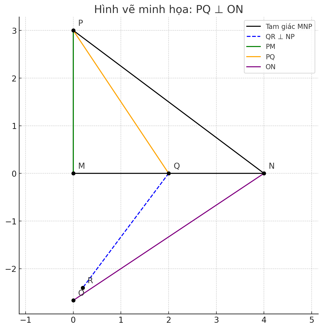 - \( QR \perp NP \), R thuộc NP ⇒ QR là đường cao từ Q đến NP