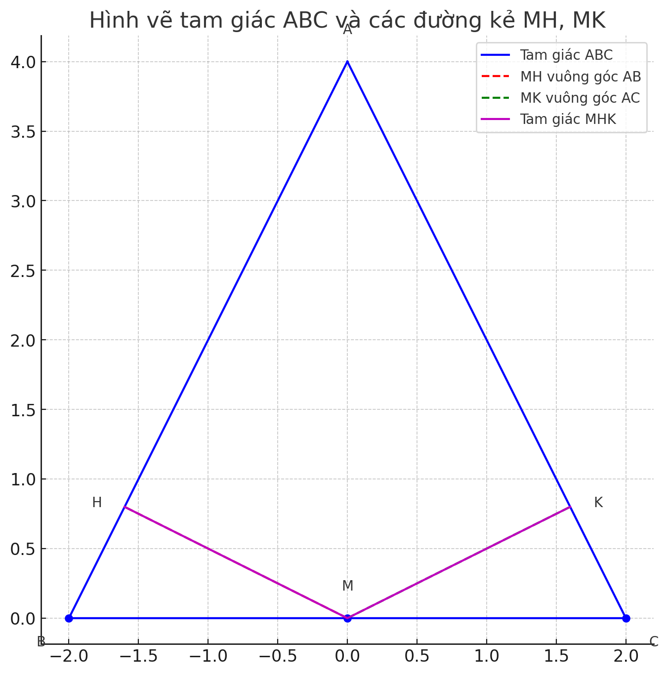 - \( MH = MK \) (vì trong hai tam giác vuông \( MH \) và \( MK \), theo kết quả tam giác \( ABM = ACM \), suy ra các đoạn vuông góc từ trung điểm M xuống hai cạnh bằng nhau)