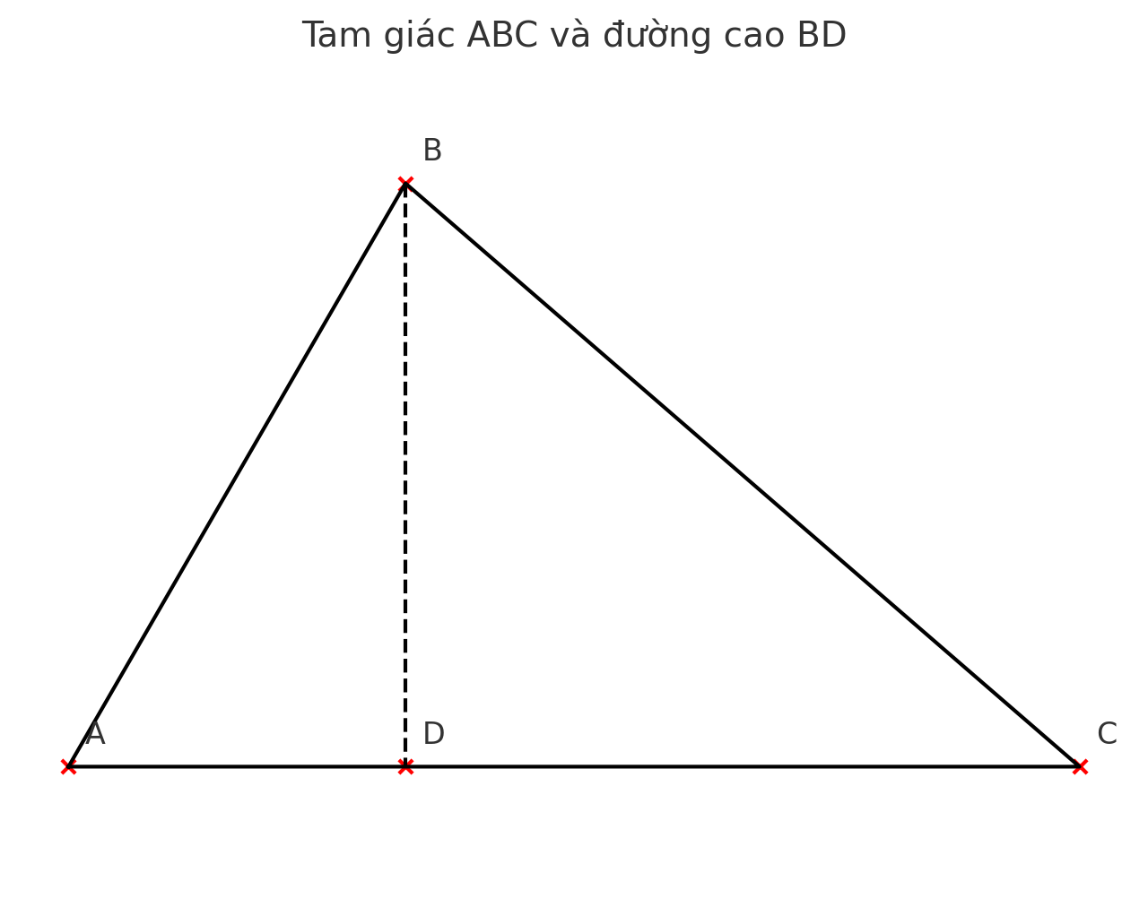 - \(BD\) là đường cao từ \(B\) hạ xuống \(AC\), nên \(D\) nằm trên \(AC\).