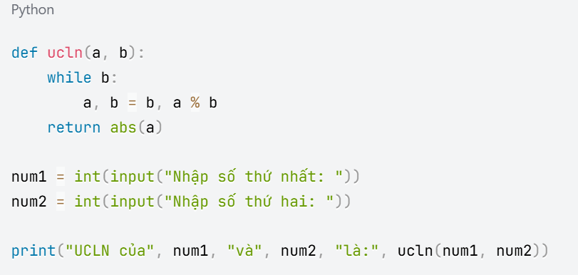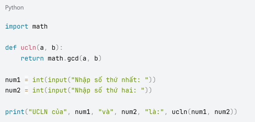 Dưới đây là code tìm Ước chung lớn nhất (UCLN) của hai số: