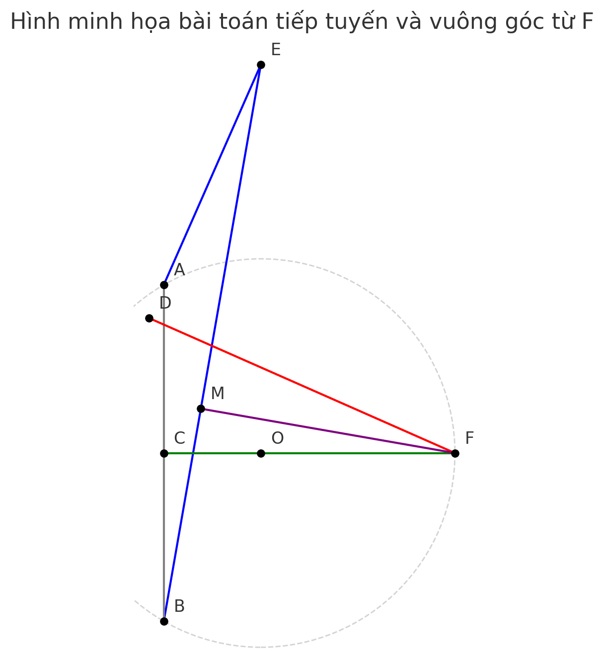 - Tam giác \( EAB \) là tam giác cân tại \( E \), với góc \( \angle AEB \) là góc giữa hai tiếp tuyến → góc này bằng 2 lần góc ở tâm tạo bởi dây AB