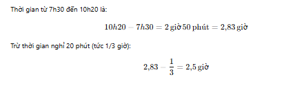 Một ô tô khởi hành từ Bắc Ninh lúc 7:30 và đến Hà Nội lúc 10:20 với vận tốc 50 km/h hỏi quãng đường từ Bắc từ từ Ninh Bình đến Hà Nội dài bao nhiêu ngày bao nhiêu kilô biết rằng dọc đường ô tô 20 phút