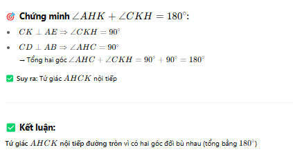 Cho đường tròn tâm O đường kính AB gọi H là giao điểm cố định nằm giữa O và b kẻ dây CD vuông góc với AB tại H Trên Cung nhỏ AC lấy điểm E bất kì e khác a và c kẻ ck vuông góc với AE tại K đường thẳng D E cắt ck tại F a chứng minh rằng tứ giác ah ck nội tiếp đường tròn