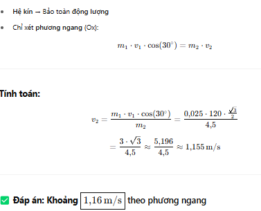 khi bắn một mục tiêu trên cao,vận động viên thường giương súng lên một góc 300.Khi bắn,viên đạn 25g được bắn khỏi nòng súng trường 4,5kg với tốc độ 120m/s thì vận động viên có tốc độ giật theo phương ngang là bao nhiêu? xem như hệ vận động viên ,súng, đạn là kín