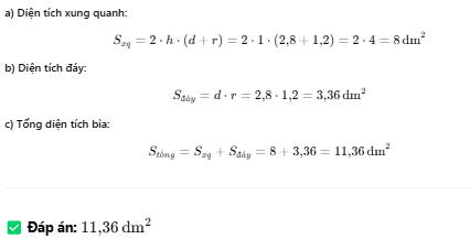 Người ta làm một chiếc túi bằng bìa cứng dạng hình hộp chữ nhật không nắp có chiều dài 2,8 dm chiều rộng 1,2 dm chiều cao 1 dm tính diện tích bìa cứng để làm chiếc túi đó biết rằng các mép dán là không đáng kể