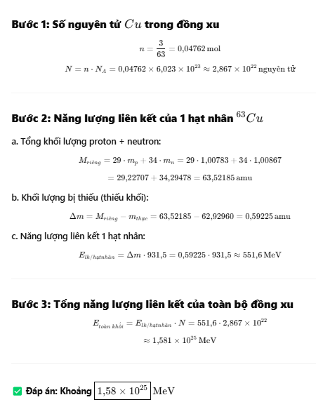 Bỏ qua năng lượng liên kết của các electron trong đồng xu. Lấy khối lượng của 23 Cu, proton và neutron lần lượt là 62,92960 amu, 1,00783 amu và 1,00867 amu. Cho biết hằng số Avogadro là