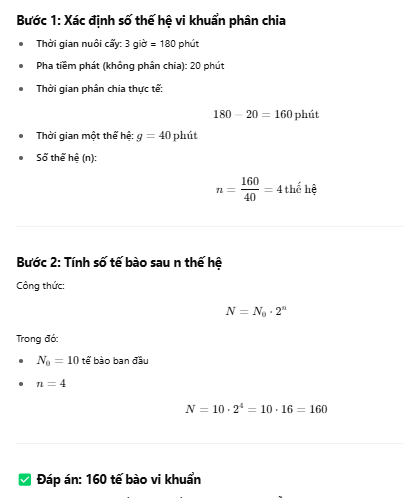 Cho 10 tế bào của một chủng vi khuẩn vào bình nuôi cấy liên tục. Biết rằng chủng sinh vật này có thời gian thế hệ là g = 40 phút và pha tiềm phát kéo dài 20 phút. Hỏi sau 3 giờ nuôi cấy, theo lí thuyết số tế bào vi khuẩn thu được trong bình là bao nhiêu? ( GIÚP TỚ VS MN ƠI !)