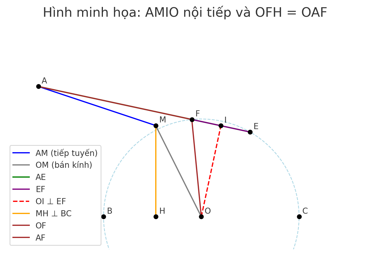 Từ đó, ∠OAF=∠OMH (hai góc nội tiếp cùng chắn cung OH trong đường tròn ngoại tiếp AMHO).
