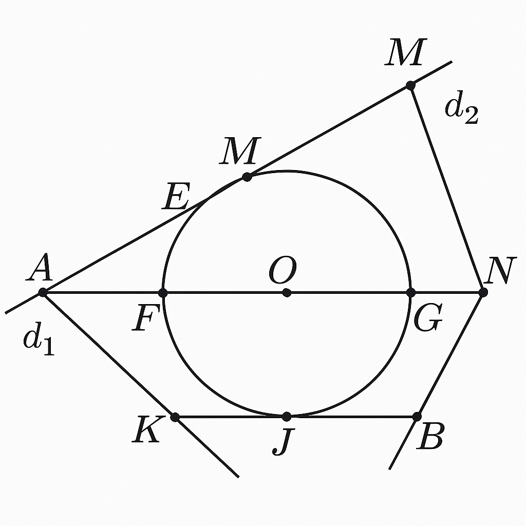 Tiếp tuyến thứ ba tại H cắt d₁ và d₂ lần lượt tại M và N ⇒ HM ⊥ OA, HN ⊥ OB